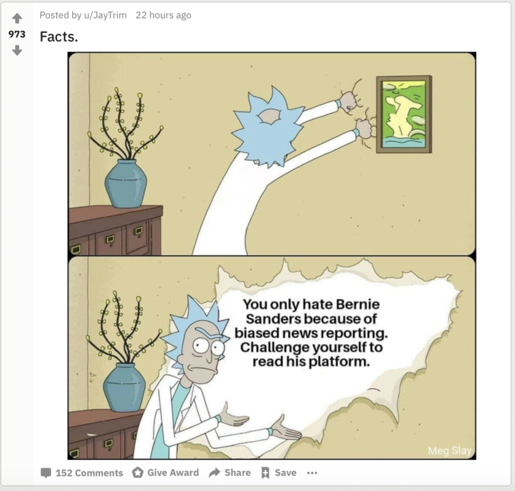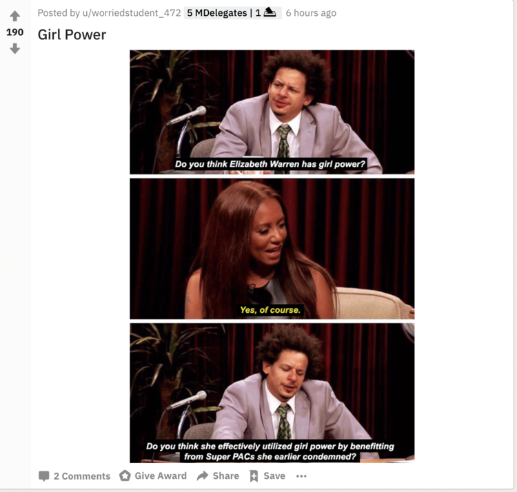 Politically-involved individuals are also creating memes that aren’t solely in support of one candidate, establishing a larger political discourse in a less serious format. The Facebook group, “2020 Memes for Undecided Tweens,” depends upon member-generated posts that often poke fun at one or more candidates or at the 2020 election as a whole.